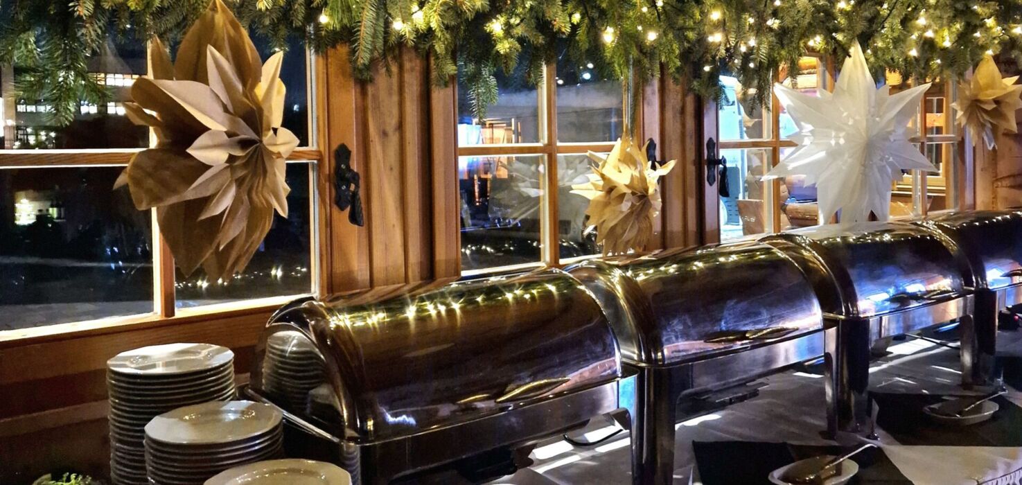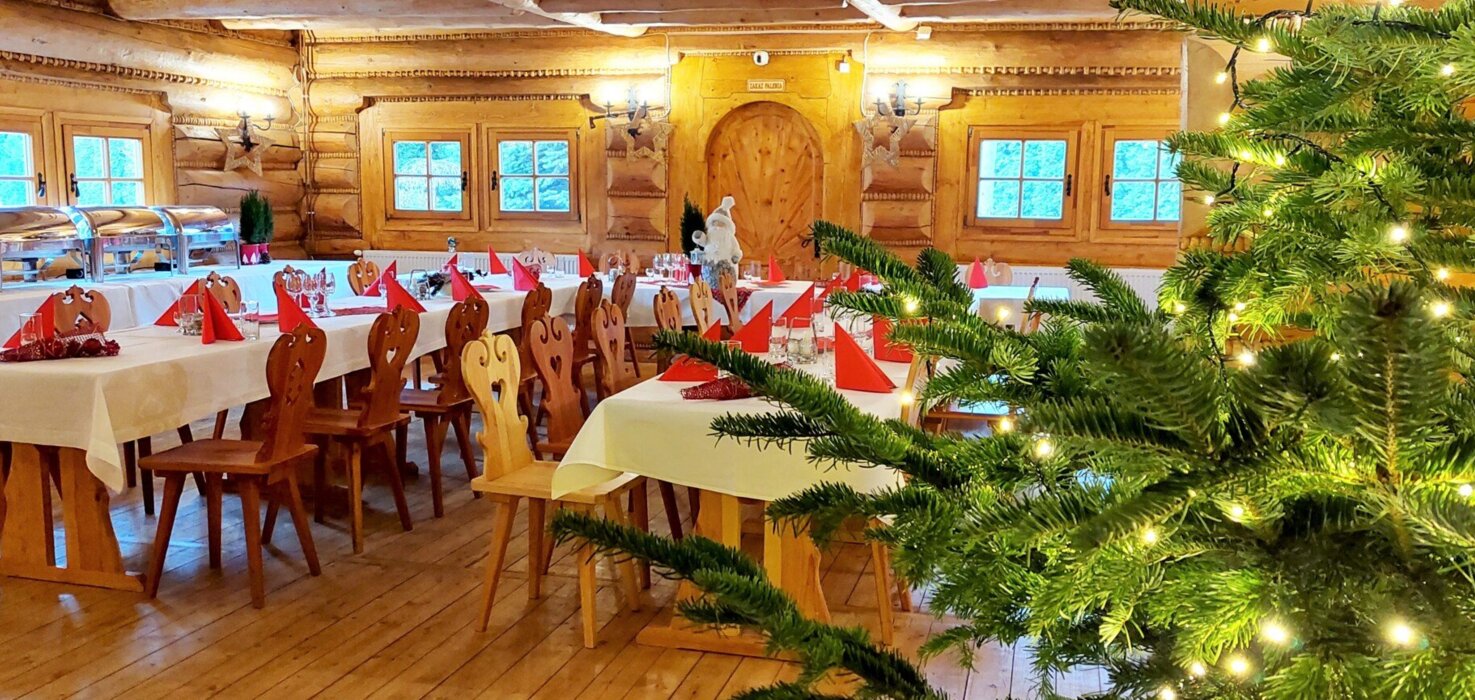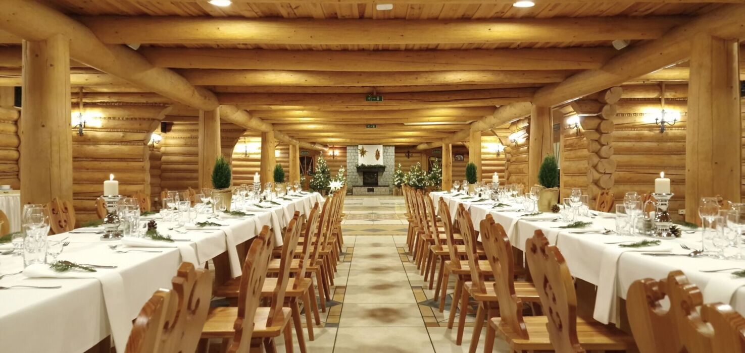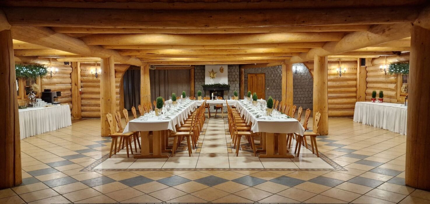 Przestronna, 300-metrowa sala z kominkami po obu stronach – idealna na wigilię firmową dla grup od 50 do 150 osób. Drewniane wnętrza i tradycyjny góralski wystrój tworzą ciepłą i wyjątkową atmosferę świąteczną.